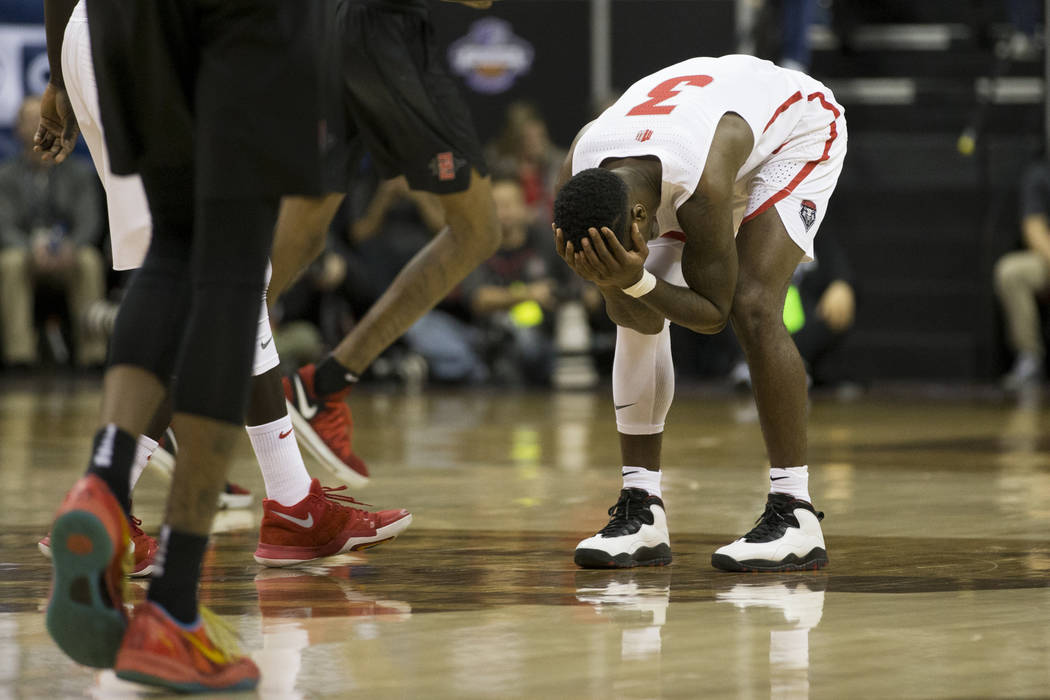 New Mexico Lobos guard Antino Jackson (3) reacts after a play against San Diego State Aztecs in the second half of the Mountain West Conference men's basketball tournament final at the Thomas & Mack Center in Las Vegas, Saturday, March 10, 2018. Erik Verduzco Las Vegas Review-Journal @Erik_Verduzco