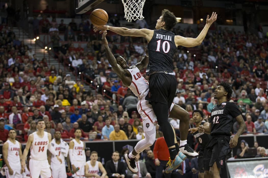 New Mexico Lobos guard Antino Jackson (3) is fouled against San Diego State Aztecs forward Max Montana (10) in the second half of the Mountain West Conference men's basketball tournament final at the Thomas & Mack Center in Las Vegas, Saturday, March 10, 2018. Erik Verduzco Las Vegas Review-Journal @Erik_Verduzco