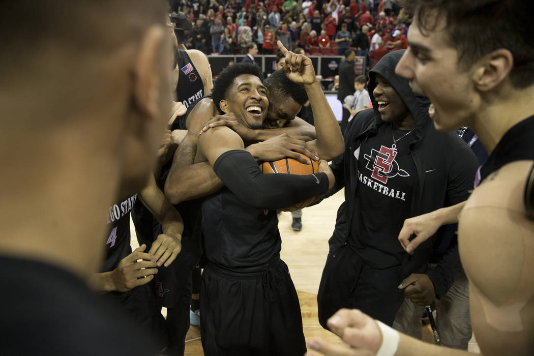 San Diego State Aztecs guard Devin Watson (0) is hugged by forward Malik Pope (21) after their win in the Mountain West Conference men's basketball tournament final at the Thomas & Mack Center in Las Vegas, Saturday, March 10, 2018. Erik Verduzco Las Vegas Review-Journal @Erik_Verduzco