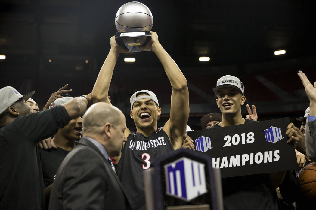 San Diego State Aztecs guard Trey Kell (3) raises his most valuable player trophy following a win against New Mexico Lobos in the Mountain West Conference men's basketball tournament final at the Thomas & Mack Center in Las Vegas, Saturday, March 10, 2018. Erik Verduzco Las Vegas Review-Journal @Erik_Verduzco