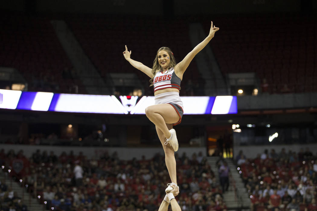 A cheerleader performs in the first half of the Mountain West Conference men's basketball tournament final at the Thomas & Mack Center in Las Vegas, Saturday, March 10, 2018. Erik Verduzco Las Vegas Review-Journal @Erik_Verduzco