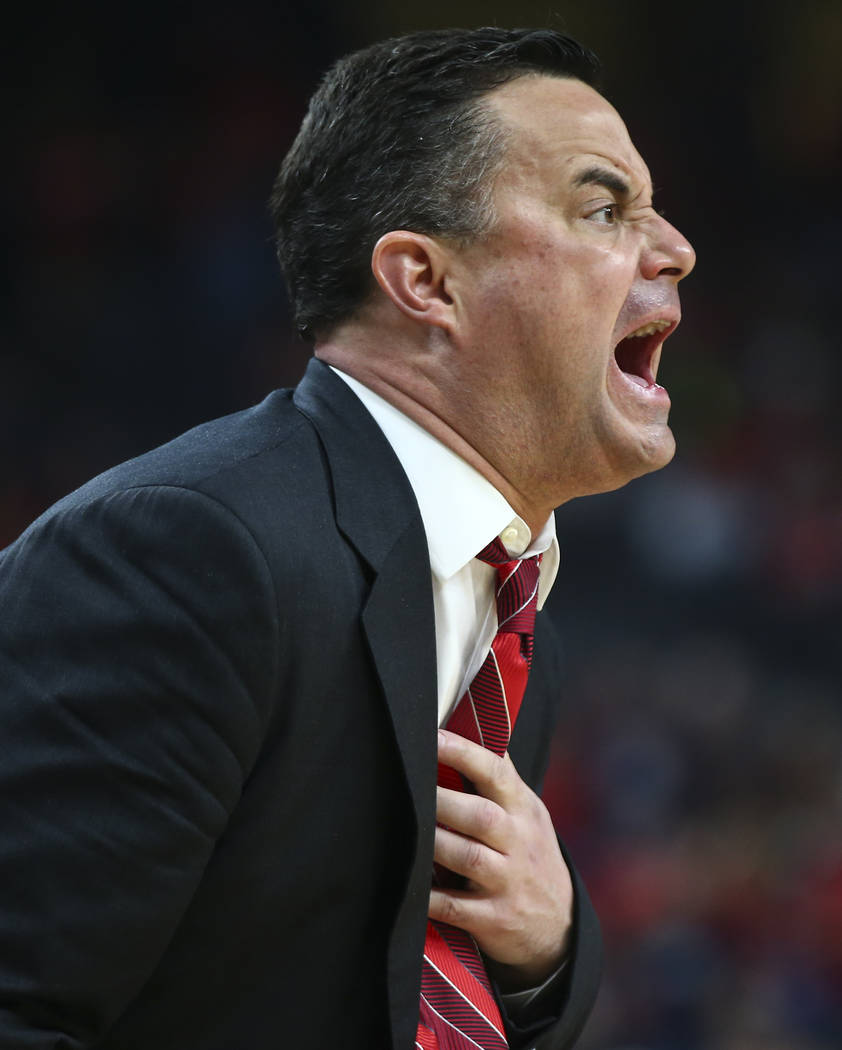 Arizona Wildcats head coach Sean Miller reacts as his team plays the USC Trojans during the Pac-12 tournament championship basketball game at T-Mobile Arena in Las Vegas on Saturday, March 10, 2018. Chase Stevens Las Vegas Review-Journal @csstevensphoto