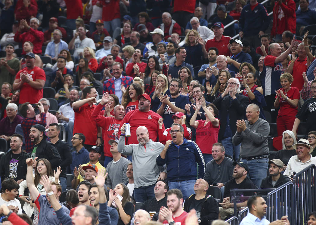Arizona Wildcats fans react as their team plays the USC Trojans during the Pac-12 tournament championship basketball game at T-Mobile Arena in Las Vegas on Saturday, March 10, 2018. Chase Stevens Las Vegas Review-Journal @csstevensphoto