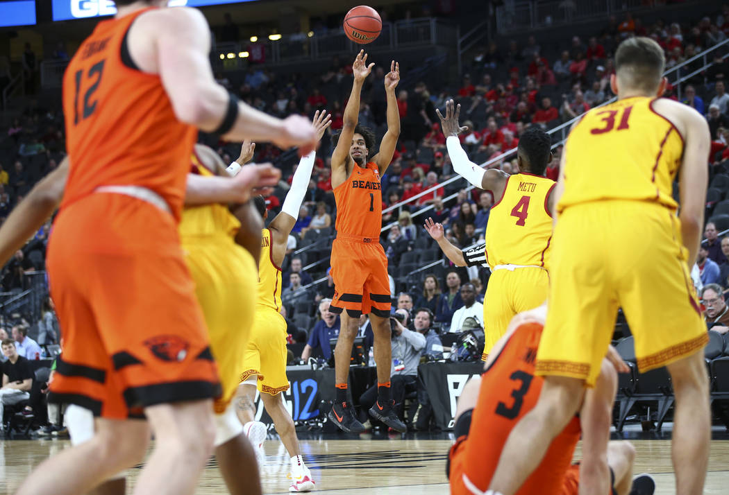 Oregon State Beavers guard Stephen Thompson Jr. (1) shoots against the USC Trojans during the Pac-12 basketball tournament at T-Mobile Arena in Las Vegas on Thursday, March 8, 2018. Chase Stevens Las Vegas Review-Journal @csstevensphoto