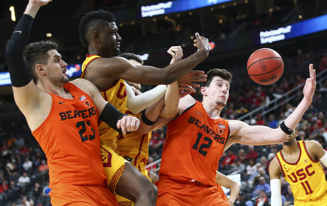 Oregon State Beavers forward Drew Eubanks (12) and center Gligorije Rakocevic (23) reach for a rebound against USC Trojans forward Chimezie Metu (4) during the Pac-12 basketball tournament at T-Mobile Arena in Las Vegas on Thursday, March 8, 2018. Chase Stevens Las Vegas Review-Journal @csstevensphoto