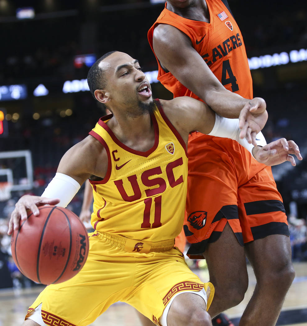 USC Trojans guard Jordan McLaughlin (11) drives as Oregon State Beavers forward Alfred Hollins (4) defends during the Pac-12 basketball tournament at T-Mobile Arena in Las Vegas on Thursday, March 8, 2018. Chase Stevens Las Vegas Review-Journal @csstevensphoto