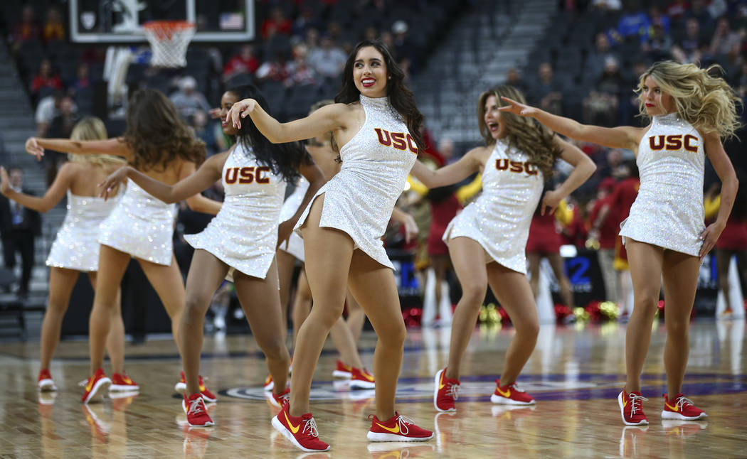 USC Trojans cheerleaders perform during a break as their team plays the Oregon State Beavers during the Pac-12 basketball tournament at T-Mobile Arena in Las Vegas on Thursday, March 8, 2018. Chase Stevens Las Vegas Review-Journal @csstevensphoto