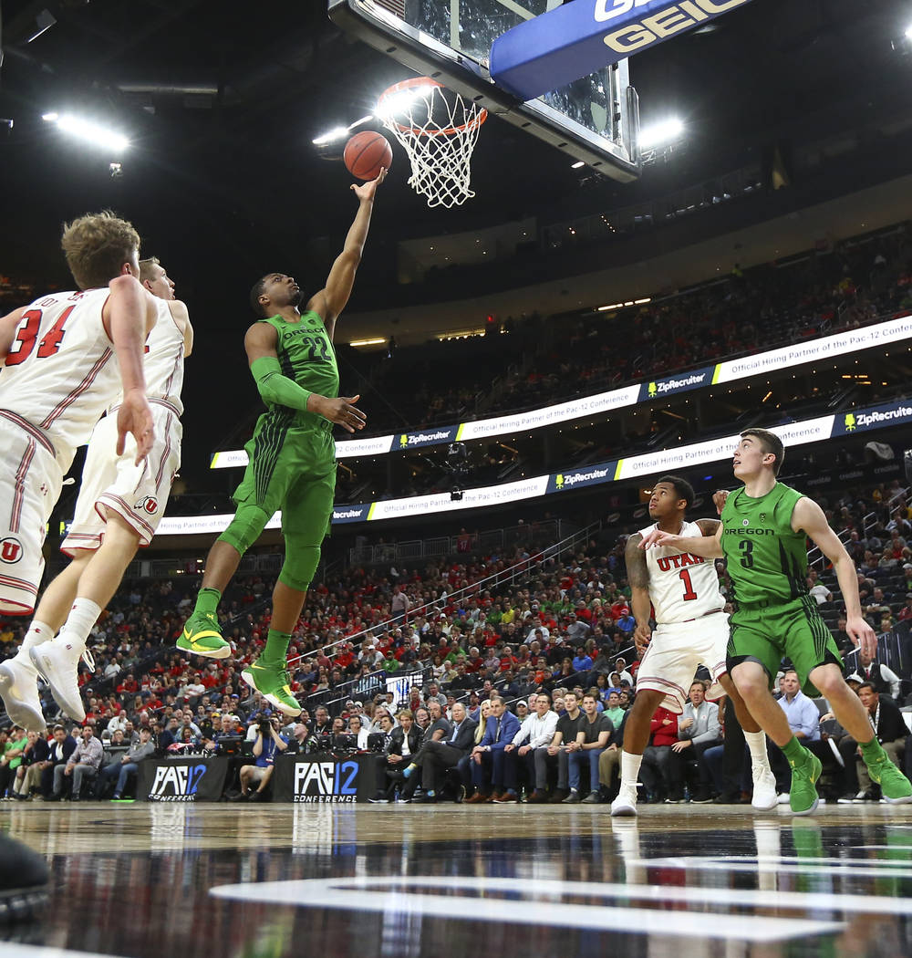 Oregon Ducks forward MiKyle McIntosh (22) goes to the basket against the Utah Utes during the Pac-12 basketball tournament at T-Mobile Arena in Las Vegas on Thursday, March 8, 2018. Chase Stevens Las Vegas Review-Journal @csstevensphoto