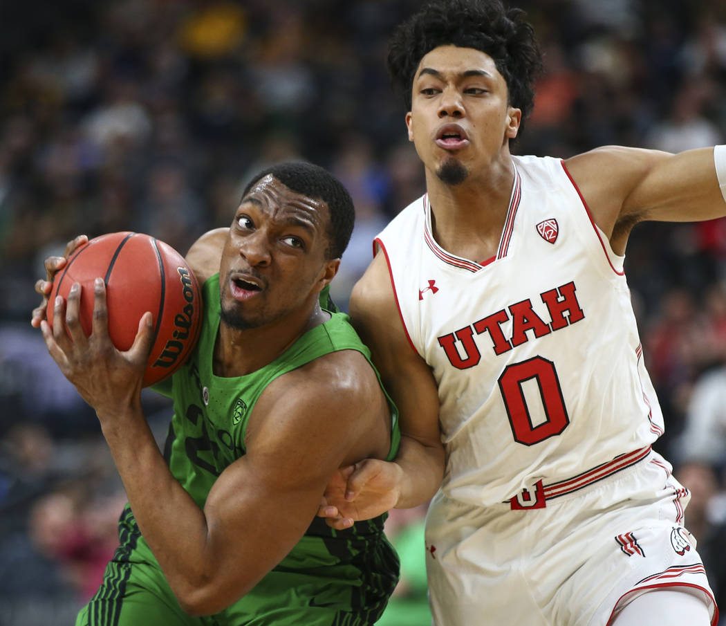 Oregon Ducks forward MiKyle McIntosh (22) eyes the basket as Utah Utes guard Sedrick Barefield (0) defends during the Pac-12 basketball tournament at T-Mobile Arena in Las Vegas on Thursday, March 8, 2018. Chase Stevens Las Vegas Review-Journal @csstevensphoto