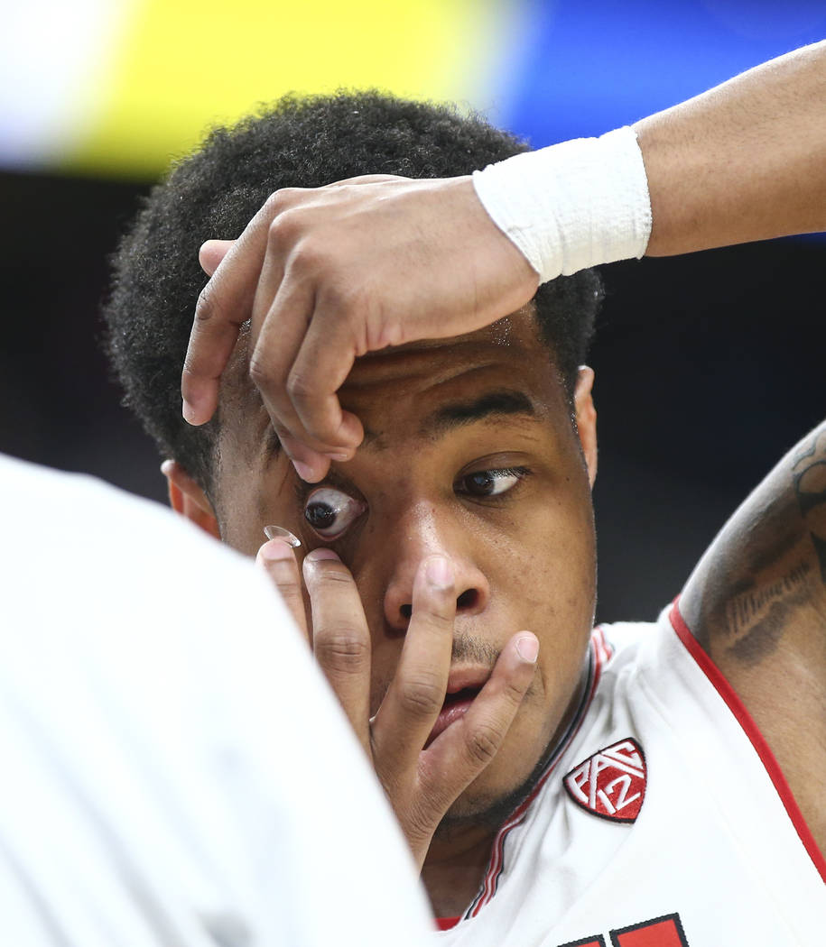 Utah Utes guard Justin Bibbins (1) replaces a contact that was lost during a game against the Oregon Ducks in the Pac-12 basketball tournament at T-Mobile Arena in Las Vegas on Thursday, March 8, 2018. Chase Stevens Las Vegas Review-Journal @csstevensphoto
