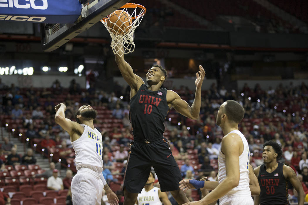 UNLV Rebels forward Shakur Juiston (10) makes a dunk in the first half of the Mountain West Conference men's basketball tournament game at the Thomas & Mack Center in Las Vegas, Thursday, March 8, 2018. Erik Verduzco Las Vegas Review-Journal @Erik_Verduzco