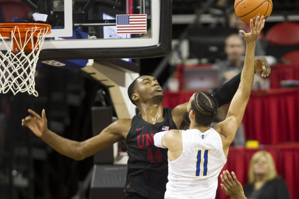 UNLV Rebels forward Brandon McCoy (44) blocks Nevada Wolf Pack forward Cody Martin (11) in the second half of the Mountain West Conference men's basketball tournament game at the Thomas & Mack Center in Las Vegas, Thursday, March 8, 2018. Nevada won 79-74. Erik Verduzco Las Vegas Review-Journal @Erik_Verduzco