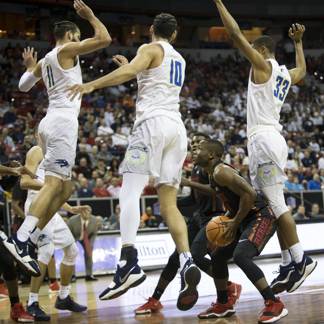 UNLV Rebels guard Jordan Johnson (24) catches Nevada Wolf Pack player on a pump fake in the second half of the Mountain West Conference men's basketball tournament game at the Thomas & Mack Center in Las Vegas, Thursday, March 8, 2018. Nevada won 79-74. Erik Verduzco Las Vegas Review-Journal @Erik_Verduzco