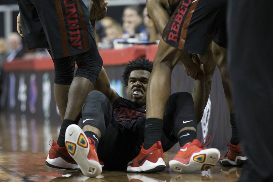 UNLV Rebels guard Jovan Mooring (30) is assisted off the floor after taking a foul in the second half of the Mountain West Conference men's basketball tournament game at the Thomas & Mack Center in Las Vegas, Thursday, March 8, 2018. Nevada won 79-74. Erik Verduzco Las Vegas Review-Journal @Erik_Verduzco