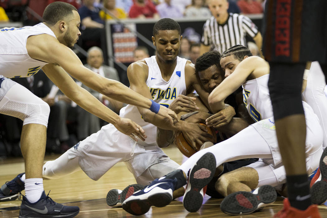 UNLV Rebels forward Shakur Juiston (10) fights for the ball against Nevada Wolf Pack players from left, Nevada Wolf Pack guard Kendall Stephens (21), guard Josh Hall (33) and forward Caleb Martin (10) in the second half of the Mountain West Conference men's basketball tournament game at the Thomas & Mack Center in Las Vegas, Thursday, March 8, 2018. Nevada won 79-74. Erik Verduzco Las Vegas Review-Journal @Erik_Verduzco