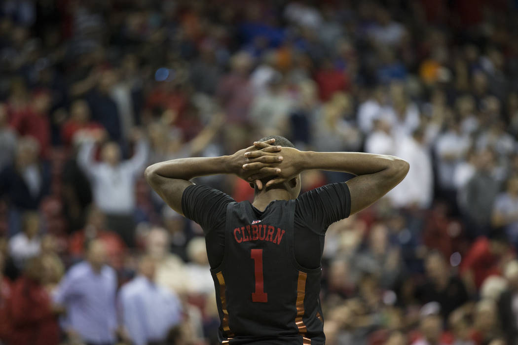 UNLV Rebels guard Kris Clyburn (1) reacts after a play against Nevada Wolf Pack in the second half of the Mountain West Conference men's basketball tournament game at the Thomas & Mack Center in Las Vegas, Thursday, March 8, 2018. Nevada won 79-74. Erik Verduzco Las Vegas Review-Journal @Erik_Verduzco