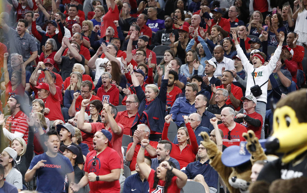 Arizona Wildcats fans cheer for their team during an NCAA college basketball game against Colorado Buffaloes in the quarter final of the Pac-12 tournament on Thursday, March 8, 2018, in Las Vegas. Arizona won 83-57. Bizuayehu Tesfaye/Las Vegas Review-Journal @bizutesfaye