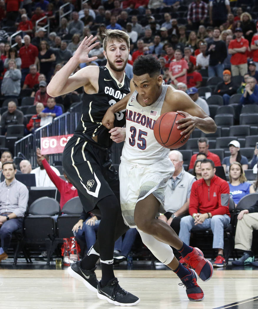 Colorado Buffaloes' McKinley Wright IV (25) and George King (24) defend Arizona Wildcats' Emmanuel Akot (24) during an NCAA college basketball game in the quarter final of the Pac-12 tournament on Thursday, March 8, 2018, in Las Vegas. Arizona won 83-57. Bizuayehu Tesfaye/Las Vegas Review-Journal @bizutesfaye