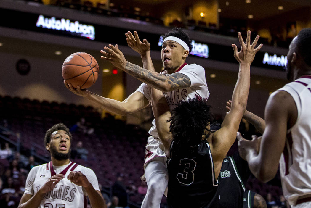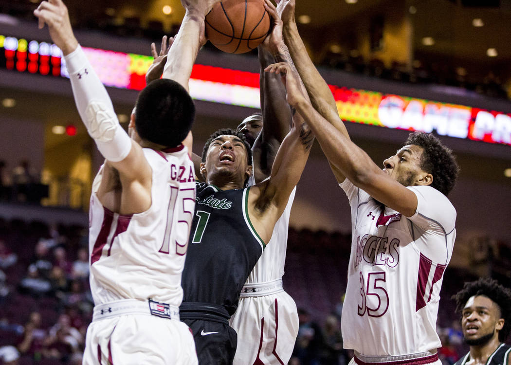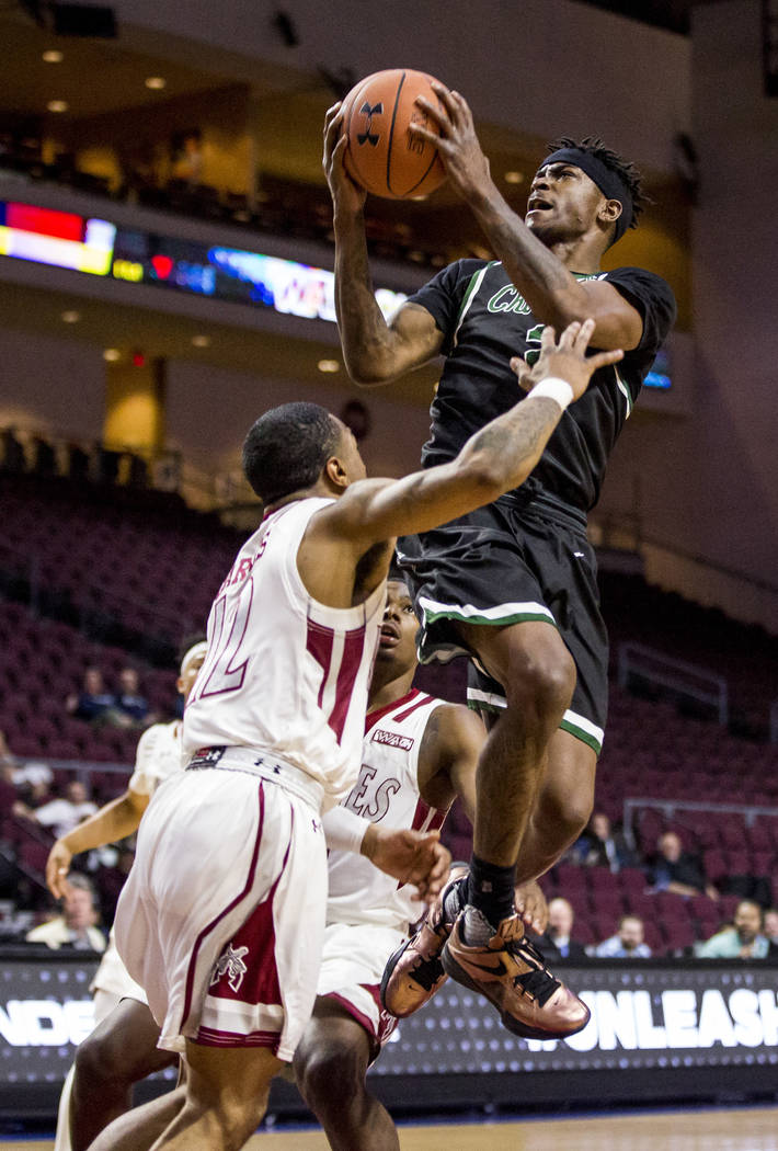 New Mexico State Aggies guard Zach Lofton (23) takes the ball up for a shot, trying to get around Chicago State Cougars forward Deionte Simmons (3) while New Mexico State Aggies forward Johnny McCants (35) stands by in the background during the second half of a WAC quarterfinal game at the Orleans Arena on Thursday, March 8, 2018. New Mexico won 97-70. Patrick Connolly Las Vegas Review-Journal @PConnPie