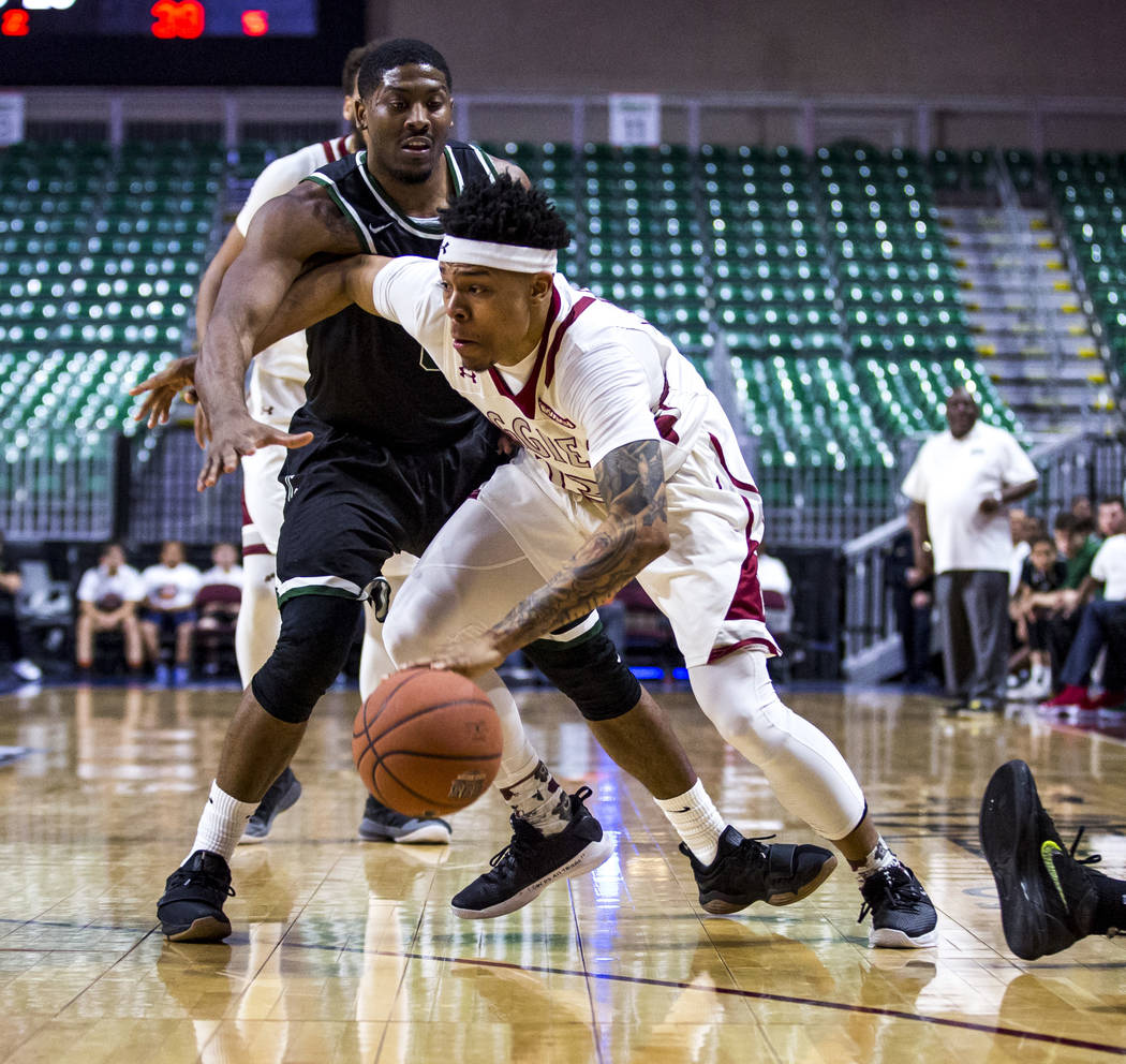 New Mexico State Aggies guard Zach Lofton (23) dribbles past Chicago State Cougars guard Glen Burns (0) during the second half of a WAC quarterfinal game at the Orleans Arena on Thursday, March 8, 2018. New Mexico won 97-70. Patrick Connolly Las Vegas Review-Journal @PConnPie