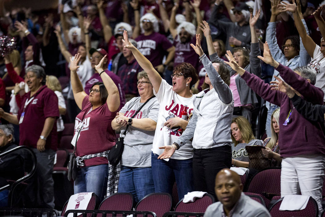 Aggies fans cheer during the t-shirt toss in the second half of a WAC quarterfinal game at the Orleans Arena on Thursday, March 8, 2018. New Mexico won 97-70. Patrick Connolly Las Vegas Review-Journal @PConnPie