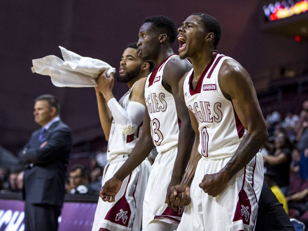 New Mexico State Aggies guard Keyon Jones (0), guard Sidy N'Dir (13) and guard Shunn Buchanan (1) cheer from the bench during the second half of a WAC quarterfinal game at the Orleans Arena on Thursday, March 8, 2018. New Mexico won 97-70. Patrick Connolly Las Vegas Review-Journal @PConnPie
