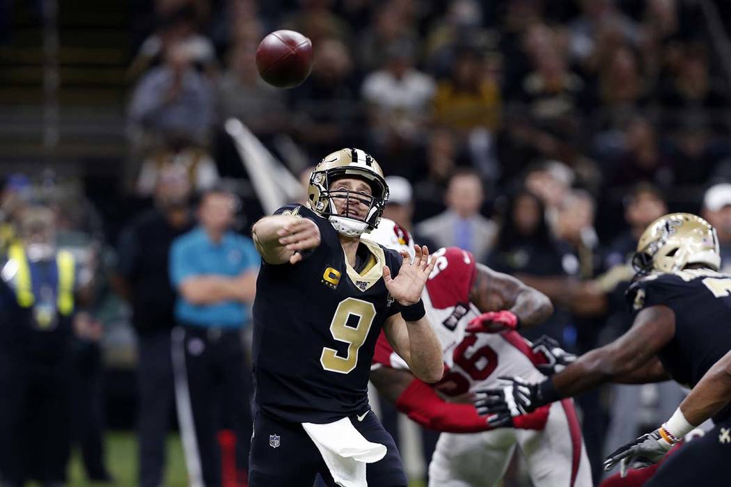New Orleans Saints quarterback Drew Brees (9) passes in the first half of an NFL football game against the Arizona Cardinals in New Orleans, Sunday, Oct. 27, 2019. (AP Photo/Gerald Herbert)