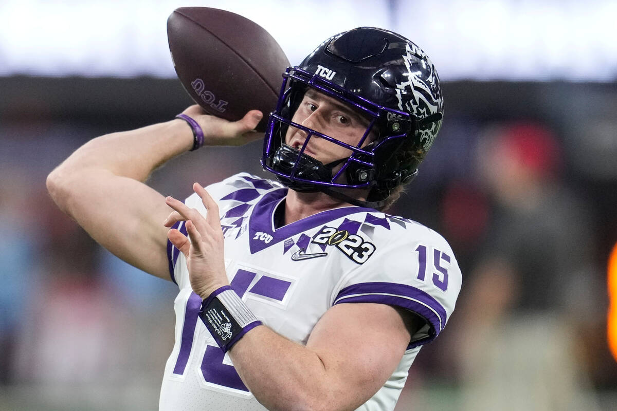 TCU props: Max Duggan 20½ completions, longest completion 42½ yards, 1½ TD passes (under -120), will throw an interception (yes -190/no +170), 32½ rushing yards; Quentin Johnston 80½ receiving yards, 4½ receptions (over -140), will score a TD (yes even/no -120); Taye Barber 32½ receiving yards, 2½ receptions (over -120); Derius Davis 28½ receiving yards, 2½ receptions (over -135).