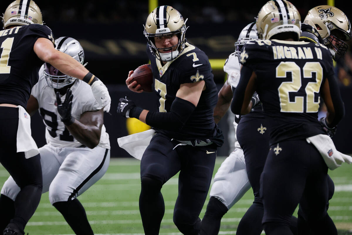 10:27 a.m.: New Orleans’ game plan was clear on that possession. Ride Alvin Kamara and Taysom Hill. Kamara gets his first rushing touchdown on the season and the Saints lead 7-0 with 1:32 left in the first quarter. The Saints are -220 on the live line (Raiders +180), total 45½.