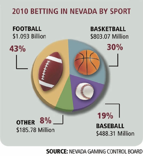 Although football remains the most popular sport in Nevada, basketball ranked second with $803 million, or 30 percent of the total amount wagered, while baseball generated $488 million, or 19 percent, in 2010. The Nevada Gaming Control Board said "other," which includes hockey and soccer, generated nearly $186 million, or 8 percent.