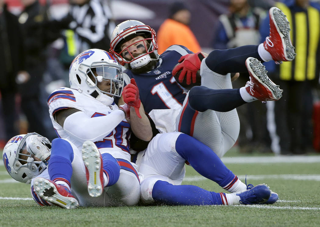 New England Patriots wide receiver Julian Edelman, right, rolls over Buffalo Bills defenders including Rafael Bush (20) on the way to a touchdown after catching a pass during the second half of an NFL football game, Sunday, Dec. 23, 2018, in Foxborough, Mass. (AP Photo/Steven Senne)