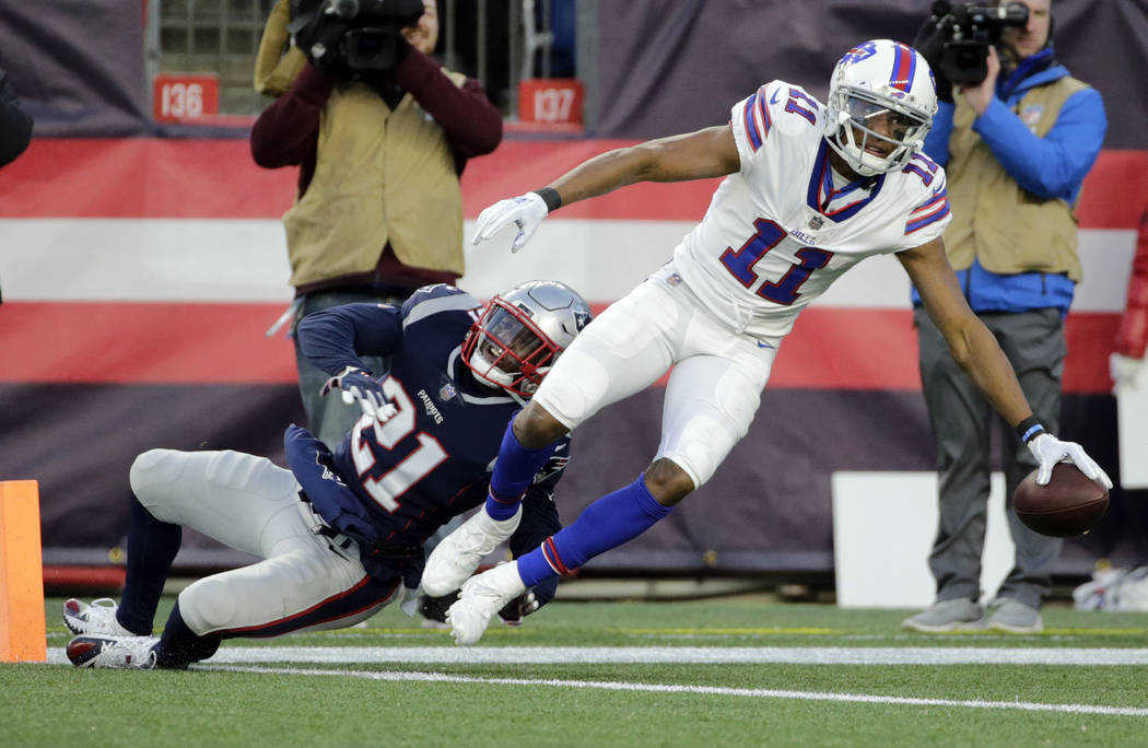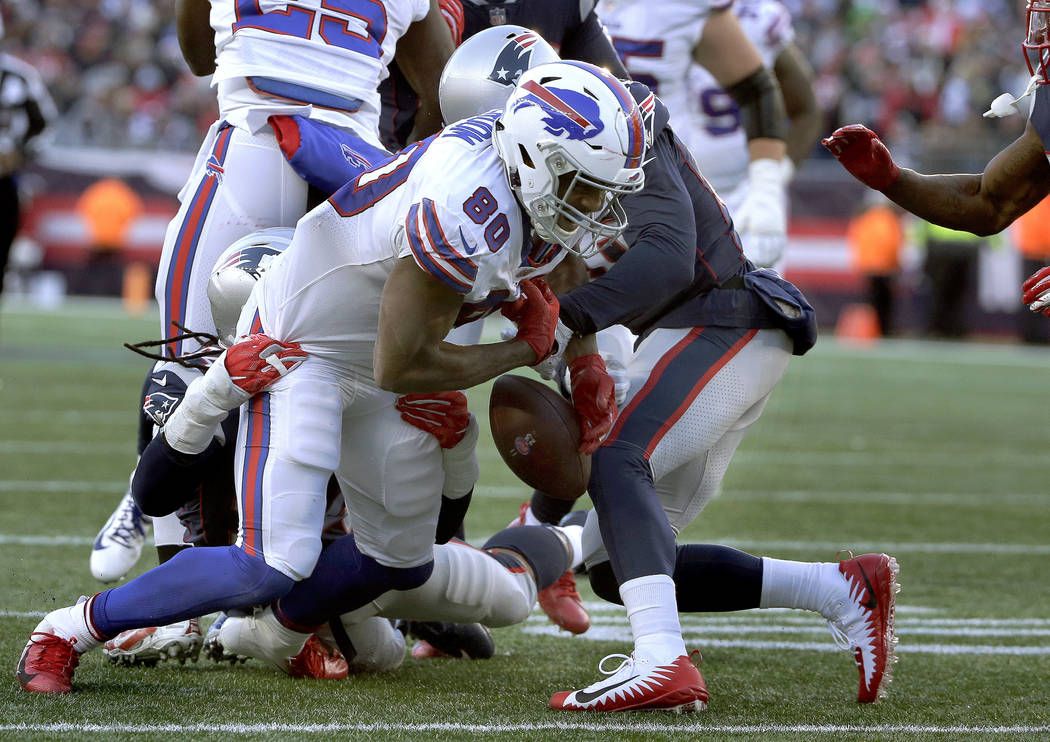 Buffalo Bills wide receiver Zay Jones (11) slips from the grasp of New England Patriots defensive back Duron Harmon (21) and reaches across the goal line for a touchdown during the second half of an NFL football game, Sunday, Dec. 23, 2018, in Foxborough, Mass. (AP Photo/Elise Amendola)