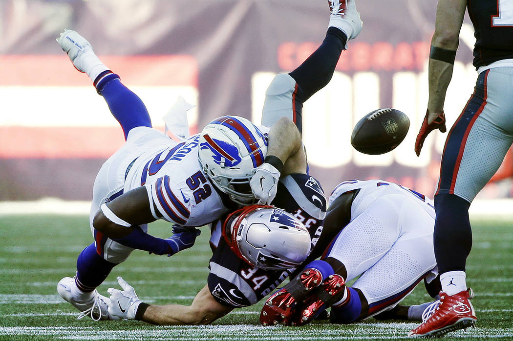 New England Patriots running back Rex Burkhead (34) fumbles on a tackle by Buffalo Bills linebacker Corey Thompson (52) during the first half of an NFL football game, Sunday, Dec. 23, 2018, in Foxborough, Mass. (AP Photo/Steven Senne)