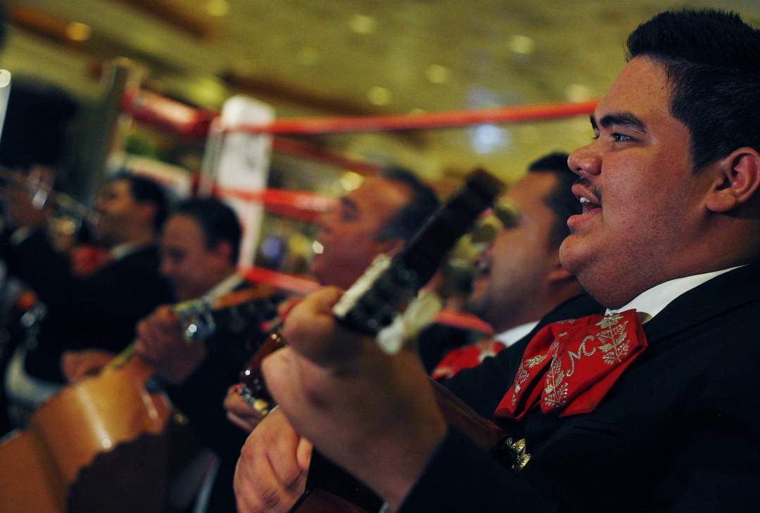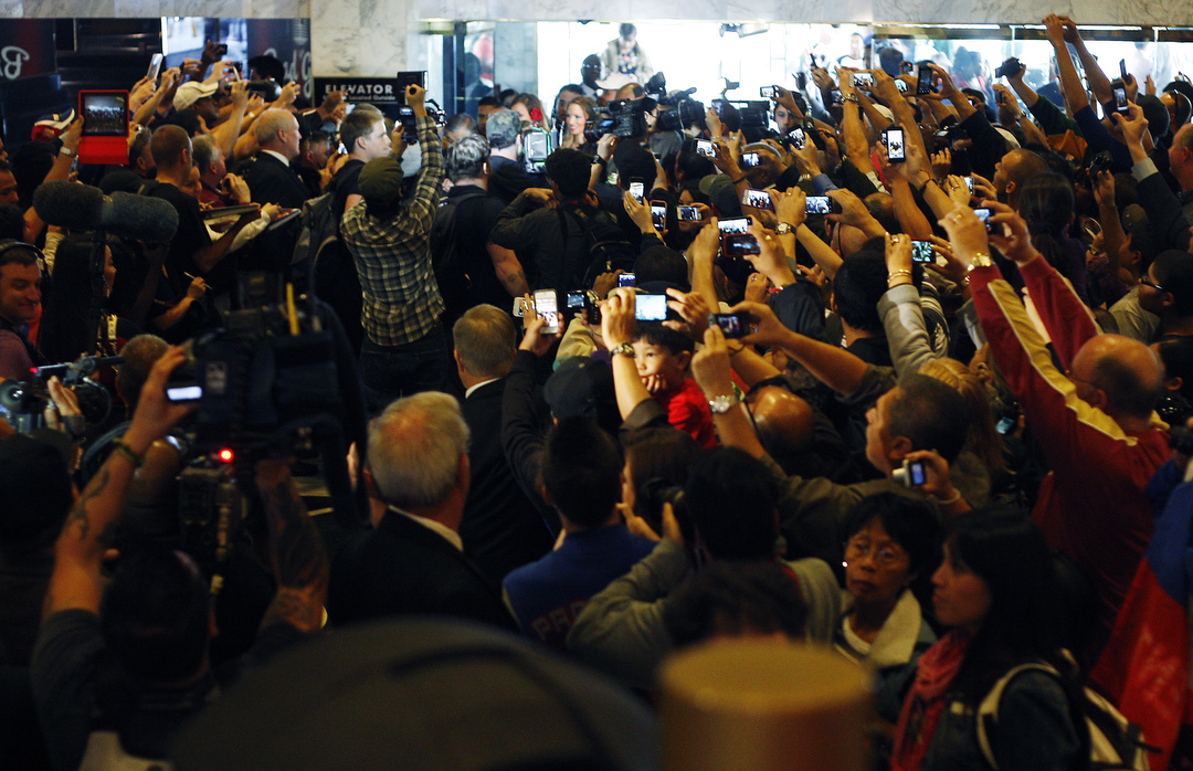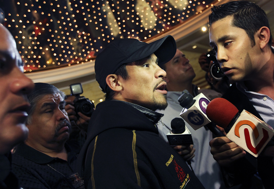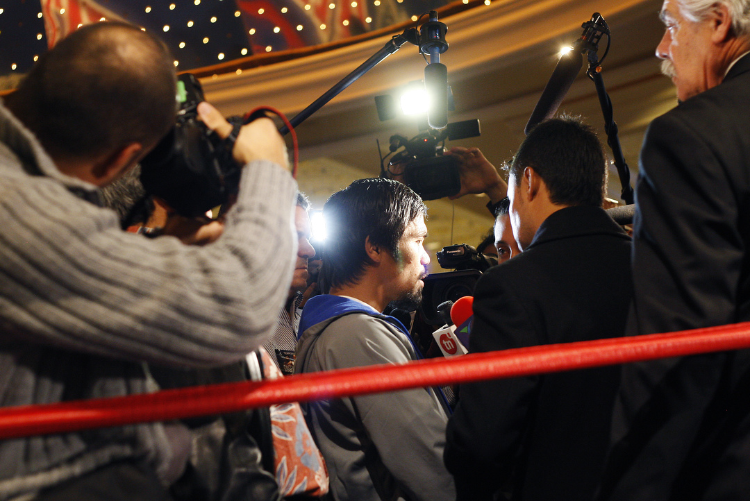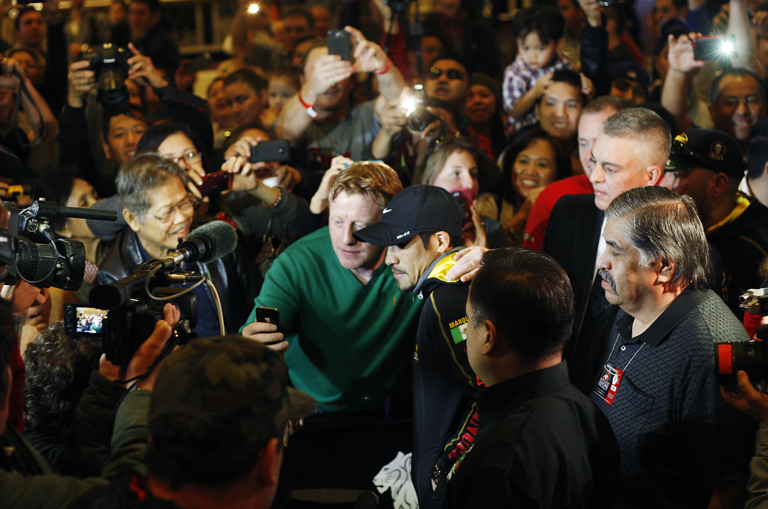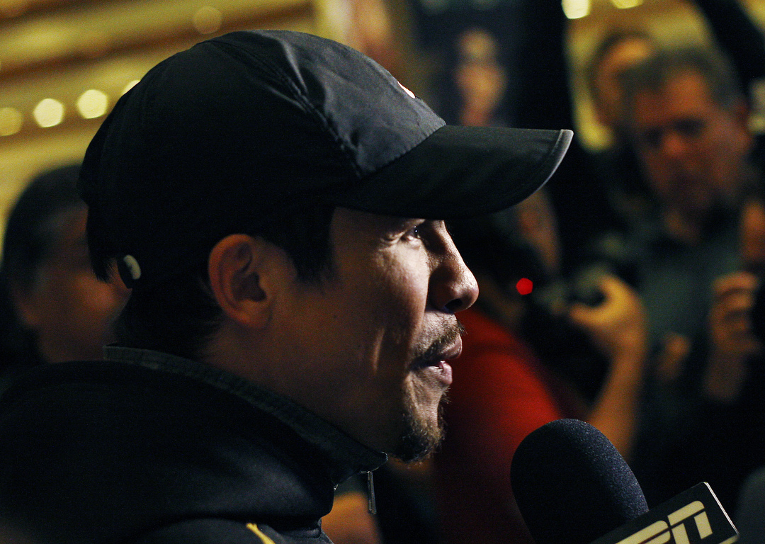 Boxers Manny Pacquiao and Juan Manuel Marquez arrive at the MGM Grand in Las Vegas prior to their fourth fight against each other on Dec. 4, 2012.