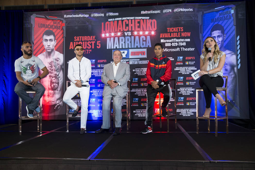 Arum said he’s all-in with allowing ESPN to televise Top Rank’s biggest stars, including Pacquiao, Lomachenko and Terence Crawford. The exciting Lomachenko is next up on the ESPN schedule on Aug. 5 when he defends his junior lightweight title against Marriaga.