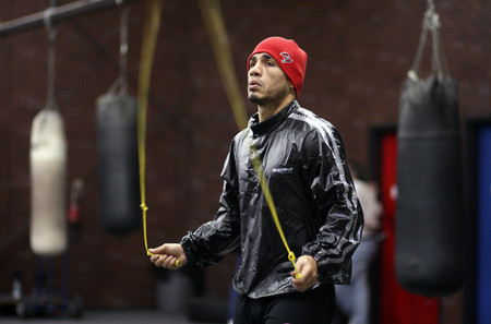 He looks lean as he prepares to train. He's not talking, leaving that to his trainer, Joe Santiago. He has no time to waste.