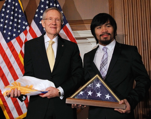 “The Filipino community looks up to Manny,” Reid said in a Senate speech introducing Pacquiao. “He sets a welcome example of an athlete who does good for many. He is someone who isn’t in public service for fame or glory or money but because he knows people need his voice.”
