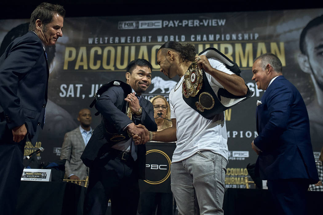 “I have been in boxing for two decades and I am never scared or intimidated with my opponent, and I am so excited for this fight,” Pacquiao said Tuesday at a news conference announcing the Fox pay-per-view bout at the MGM Grand Garden Arena. “Keith Thurman is the kind of fighter you can respect. He is undefeated and this gives me more encouragement, motivation to work hard — like I did before, in my previous fights with big names in boxing.