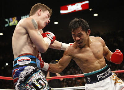 But Hatton was unable to hold for very long. Pacquiao set up Hatton for the first of two first-round knockdowns, using his right hand to set up the left and sent Hatton to the canvas for the first time as a junior welterweight.