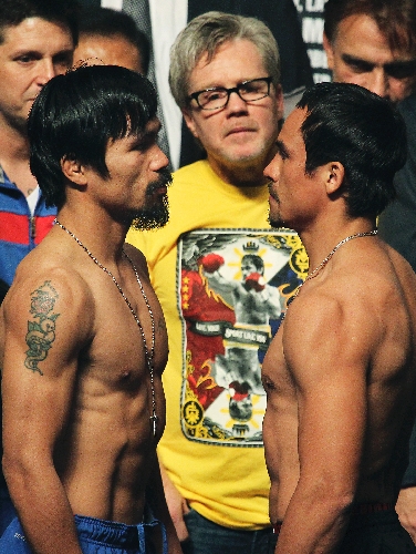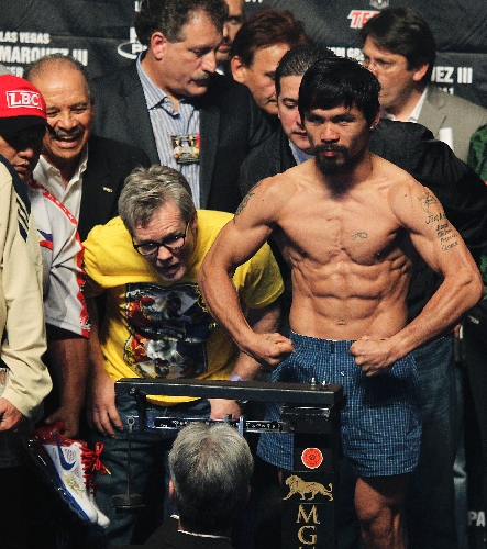 After an enhanced training program, Marquez bulked up considerably for the fight. At Friday's weigh-in at the Grand Garden before 5,500 fans, Marquez weighed 142 and Pacquiao 143.