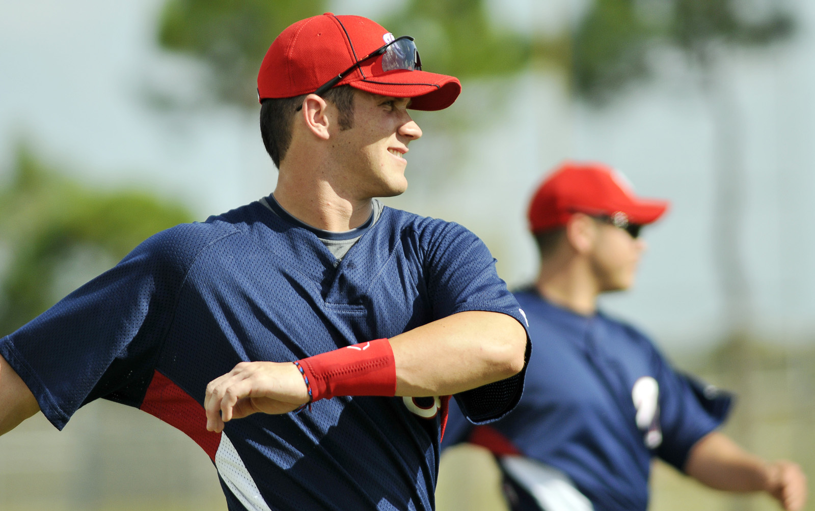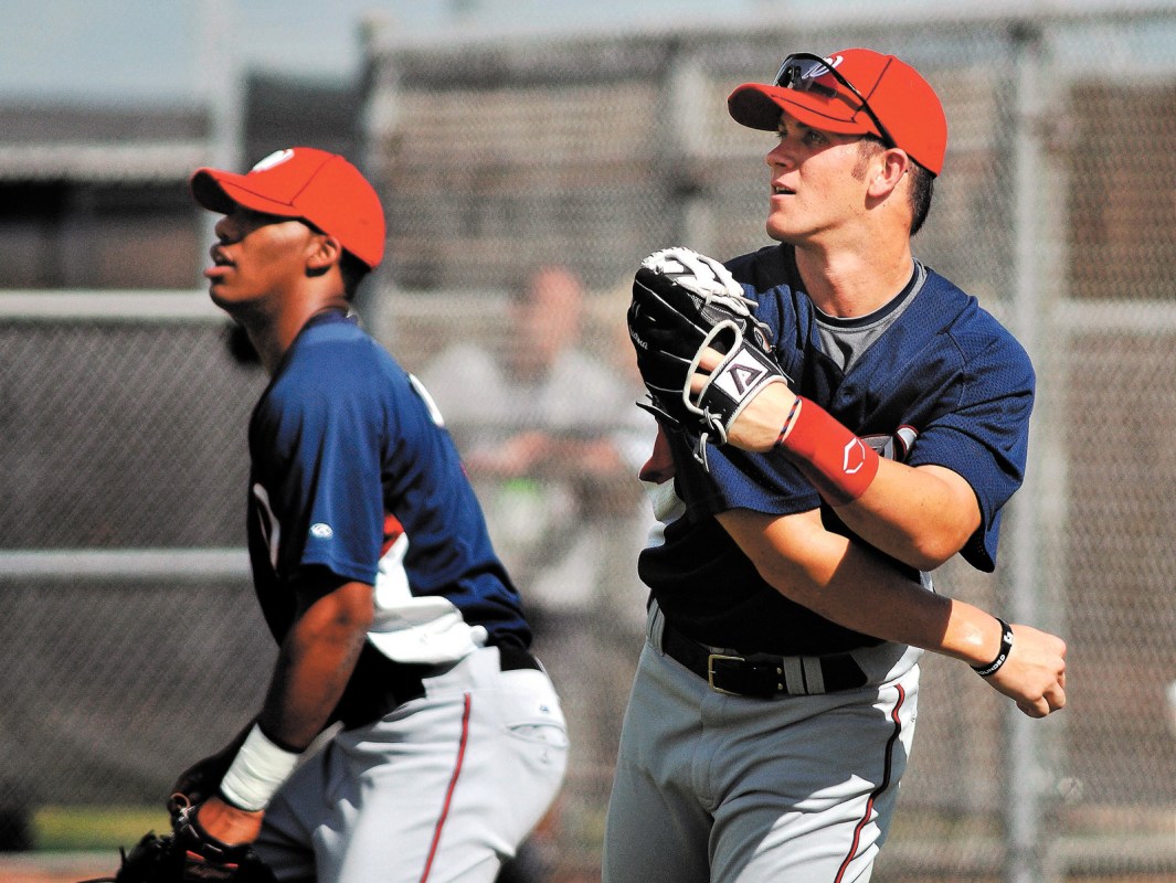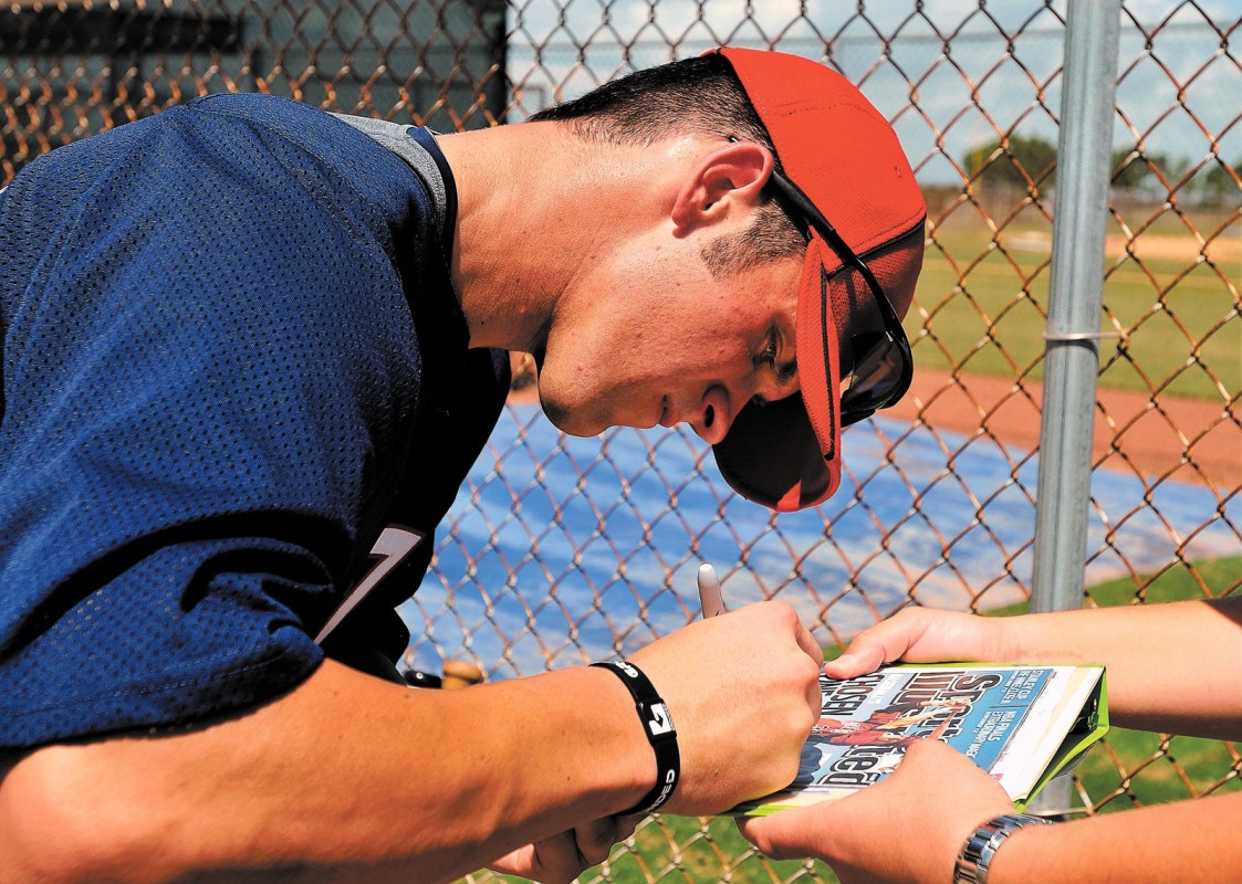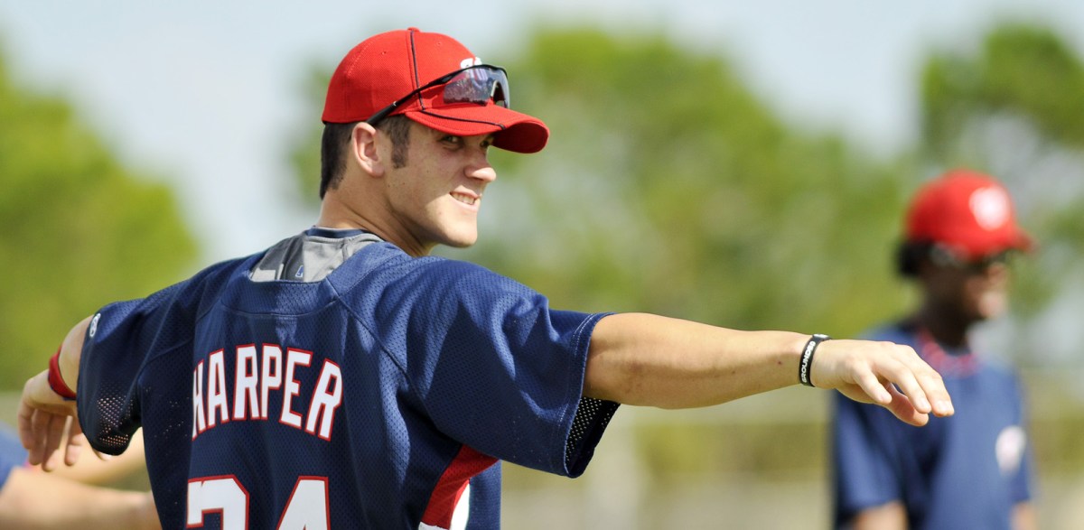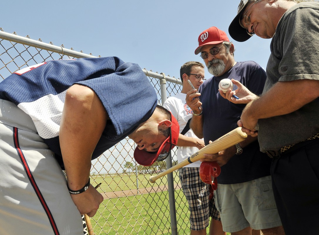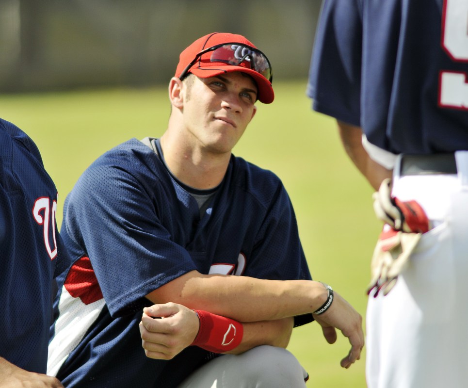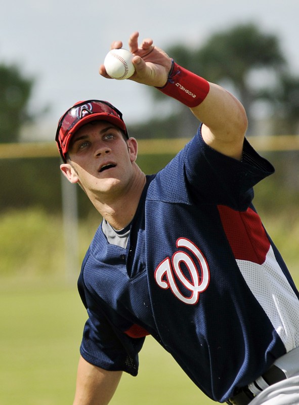 Bryce Harper, 17, from Las Vegas touched every base on his first on-field day as a professional baseball player Friday at Viera, Fla. Joining about 40 other prospects with the Washington Nationals’ entry in the Florida Instructional League, the No. 1 overall draft pick went through three hours of drills in preparation for league play, which begins Thursday. Clockwise from top left, Harper signs autographs for a long line of fans after practice; listens to instruction from infield coordinator Jeff Garber; makes practice throws alongside fellow outfield prospect Destin Hood; playfully balances his helmet on his finger while waiting his turn in a baserunning drill; and faces live pitching during batting practice.