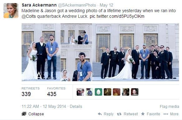 The couple’s photographer, Sara Ackermann, tweeted about the moment on Monday saying, “Madeline & Jason got a wedding photo of a lifetime yesterday when we ran into @Colts quarterback Andrew Luck.”