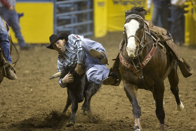 And in fact, the official online version of fantasy rodeo is celebrating its 10th anniversary at this year’s National Finals Rodeo, where there is plenty of cash on the line, along with the grand prize: a new Dodge Ram truck valued at $40,000. ProFantasyRodeo.com is the brainchild of steer wrestler K.C. Jones — who is competing in his seventh NFR at the Thomas & Mack Center — and business partner Jace Honey.