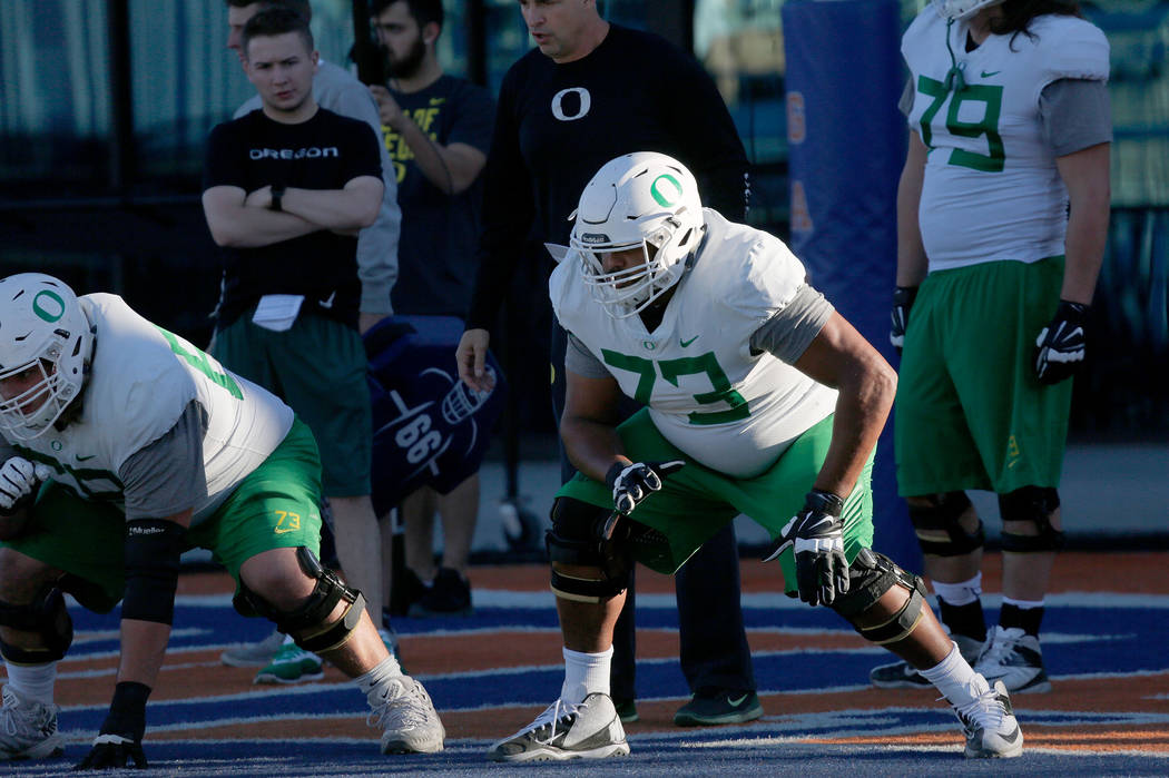 Oregon tackle Tyrell Crosby and Texas-El Paso guard Will Hernandez will be lining up together for Team North in Saturday’s game at Ladd-Peeples Stadium in Mobile, Alabama. Crosby played high school football at Green Valley, and Hernandez at Chaparral.