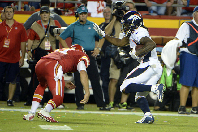 Denver (2-0) fought back with Manning's first touchdown pass of the season with 2:31 to go in the second, a 16-yard slant to Sanders, trimming the Chiefs' lead to 14-7. Kansas City (1-1) gave the ball right back.