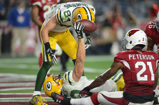 Arizona thought it had the game won after Chandler Catanzaro's 26-yard field goal with 1:55 left extended the lead to 20-13. Earlier, the Cardinals got the bounce of a lifetime when Palmer's pass intended for Fitzgerald bounced off the left arm of Packers defensive back Demarious Randall, went up into the air and right into the hands of Arizona's Michael Floyd for the go-ahead touchdown.