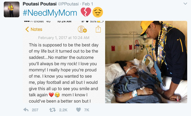 “My beautiful mother took her last breath today,” Poutasi tweeted. “Today was signing day, the day where I make her proud, the day where she can say my son is going to school for free.