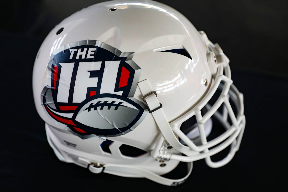 A helmet with the Indoor Football League logo at an event to announce that the Golden Knights have purchased an expansion franchise from the Indoor Football League at the Dollar Loan Center in Henderson, Tuesday, May 11, 2021. The Dollar Loan Center, still under construction and expected completion in 2022, will house both the IFL team and the American Hockey League’s Henderson Silver Knights. (Rachel Aston/Las Vegas Review-Journal) @rookie__rae