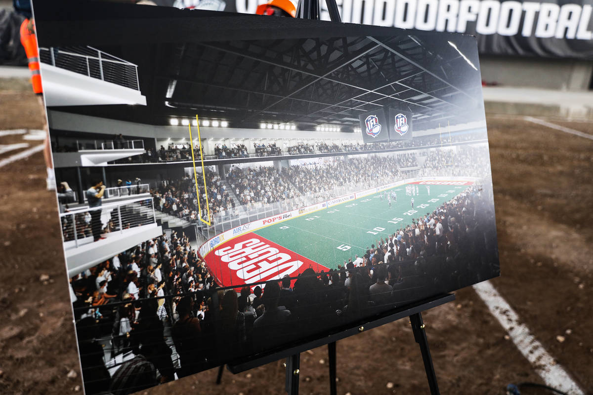 A rendering of the future Dollar Loan Center, a 6,000 seat multi-purpose venue, at an event to announce that the Golden Knights have purchased an expansion franchise from the Indoor Football League at the Dollar Loan Center in Henderson, Tuesday, May 11, 2021. The venue, still under construction and expected completion in 2022, will house both the IFL team and the American Hockey League’s Henderson Silver Knights. (Rachel Aston/Las Vegas Review-Journal) @rookie__rae