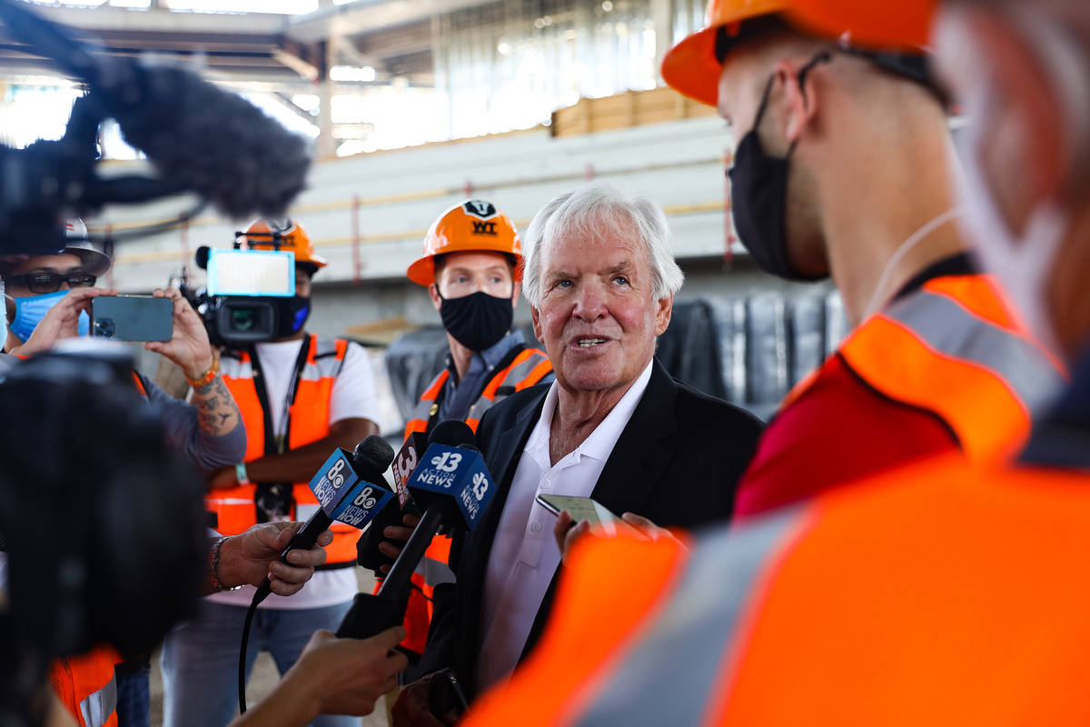 Golden Knights CEO Bill Foley speaks to the media at an event to announce that the Golden Knights have purchased an expansion franchise from the Indoor Football League at the Dollar Loan Center in Henderson, Tuesday, May 11, 2021. The Dollar Loan Center, still under construction and expected completion in 2022, will house both the IFL team and the American Hockey League’s Henderson Silver Knights. (Rachel Aston/Las Vegas Review-Journal) @rookie__rae